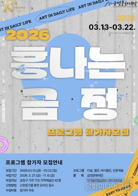 시민행정신문 강갑수 기자 | (재)금정문화재단은 2026 금정 기초 문화예술교육 지원사업 '흥나는 금정' 프로그램의 참여 지역 예술가를 오는 3월 13일부터 3월 22일까지 모집한다고 밝혔다.