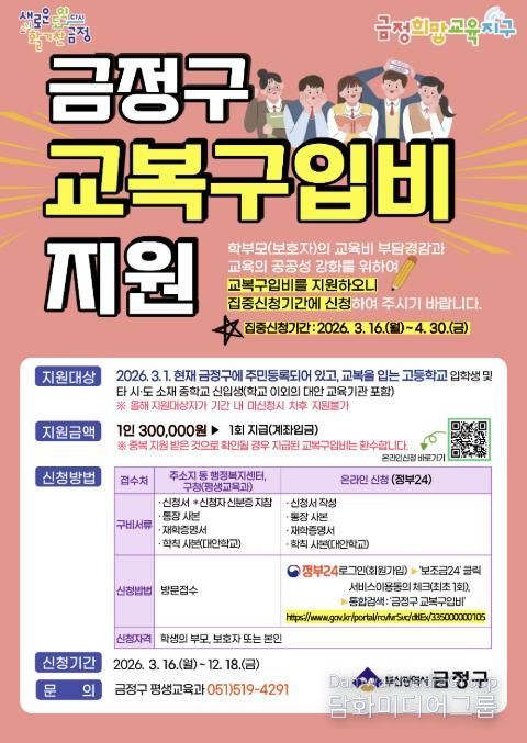 2026년 금정구 교복구입비 지원사업은 올해 3월 1일 기준으로 금정구에 주민등록이 되어 있고, 교복을 입는 고등학교 등 신입생을 대상으로 소득 수준 관계없이, 3월 16일부터 12월 16일까지 대상 학생의 학부모(보호자) 또는 학생 본인이 신청할 수 있으며, 신청 창구는 해당 주소지 동 행정복지센터, 금정구 평생교육과, 정부24(온라인)로 수시 접수가 가능하다.
