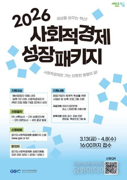 시민행정신문 강갑수 기자 | 경기도사회적경제원이 도내 대표 사회적경제조직 발굴·육성을 위해 ‘2026년 사회적경제 성장패키지’ 참여기업을 오는 4월 8일 오후 4시까지 모집한다.
