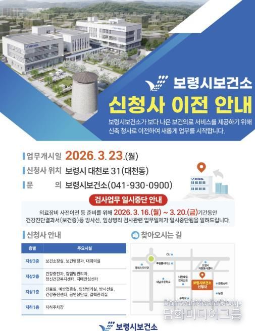 신청사는 지하 1층, 지상 4층 규모로 건립됐으며, 보건소를 비롯해 대천1동 주민자치센터, 아트센터 등이 함께 입주함으로써 원도심 활성화에도 기여할 것으로 기대된다.