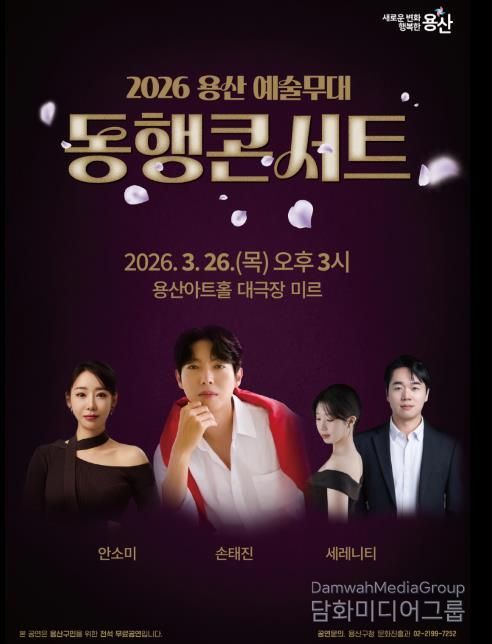 박희영 용산구청장은 “2026 용산 예술무대 동행콘서트는 더욱 다채롭고 풍성한 공연으로 준비한 만큼 구민 여러분이 일상의 피로를 잠시 내려놓고 즐길 수 있는 시간이 되길 바란다”라며 “앞으로도 품격 있는 예술 공연을 통해 구민들의 문화 향유 기회를 확대하겠다”라고 전했다.