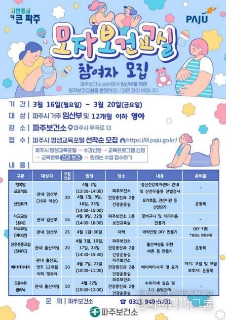 시민행정신문 기자 | 파주보건소는 건강한 임신과 출산, 행복한 육아를 지원하기 위해 4월부터 운영하는 ‘모자보건 프로그램’참여자를 모집한다.
