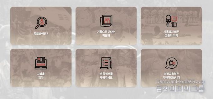 주요 메뉴는 △학도병이란 △기록으로 만나는 학도병 △기록되지 않은 그들의 기억 △그날을 읽다 △빈 학적부를 채워주세요 △경북교육청은 기억하겠습니다 등으로 구성됐다.