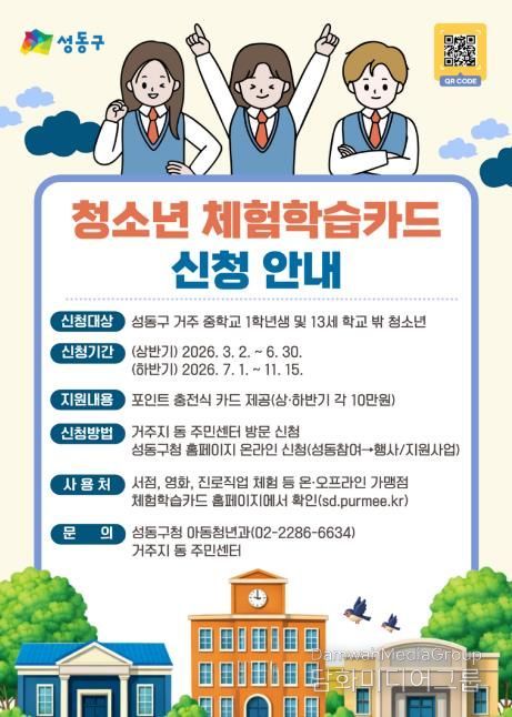 시민행정신문 이세훈 기자 | 서울 성동구는 청소년들에게 진로, 문화, 예술 등 다양한 체험활동 기회를 제공하기 위해 연간 최대 20만 원의 ‘청소년 체험학습카드’를 지원한다고 밝혔다.