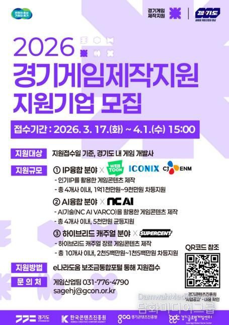 시민행정신문 강갑수 기자 | 경기도와 경기콘텐츠진흥원이 도내 게임 기업의 경쟁력 강화와 글로벌 시장 진출을 위해 ‘2026년 경기게임제작지원’과 ‘2026년 게임 상용화 지원’ 사업 참여기업을 오는 4월 1일까지 모집한다.