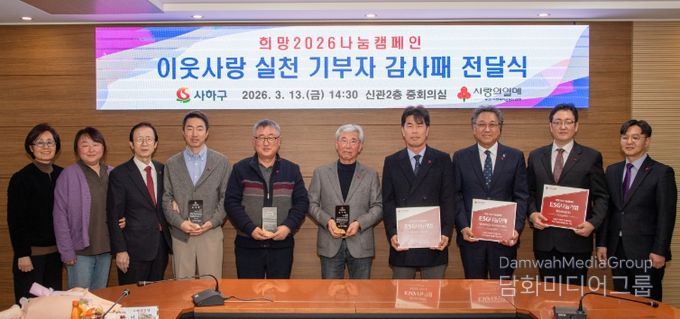 시민행정신문 강갑수 기자 | 부산 사하구는 부산사회복지공동모금회(회장 이수태)와 지난 13일 '희망2026나눔캠페인 이웃사랑 실천 기부자 감사패 전달식'을 개최해 지역사회 나눔을 실천한 기부자들에게 감사의 뜻을 전했다고 밝혔다.