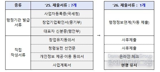 행정정보 연결로 사업자등록증, 재무제표 등 행정서류는 자동수집한다. 개인정보제공동의서 등은 온라인 체크로 대체한다. 또한, 기업 심사에 불필요한 서류는 폐지하거나 선정된 기업만 제출한다. 사업계획서 제한 분량도 평균 14장에서 9.4장까지 30% 이상 감축할 계획이다.