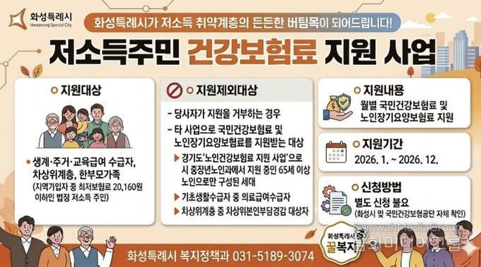 이번 사업은 건강보험료 납부에 어려움을 겪는 법정 저소득 주민을 대상으로 하며, 화성시 자체 예산 총 6억 300만 원을 투입해 올해 12월까지 연중 시행된다.