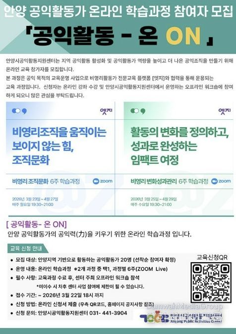 시민행정신문 강갑수 기자 | 안양시공익활동지원센터가 지역 공익활동가들의 철학적 토대를 다지는 교육을 성공적으로 마친 데 이어, 실천적 전문성을 높이기 위한 온라인 교육 과정을 본격 가동하며 활동가 지원에 박차를 가하고 있다.