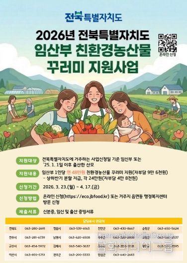 시민행정신문 강갑수 기자 | 전북특별자치도가 임산부의 건강 증진과 친환경 농산물 소비 확대를 위해‘임산부 친환경농산물 꾸러미 지원사업’신청을 오는 3월 23일부터 4월 17일까지 모집한다고 19일 밝혔다.
