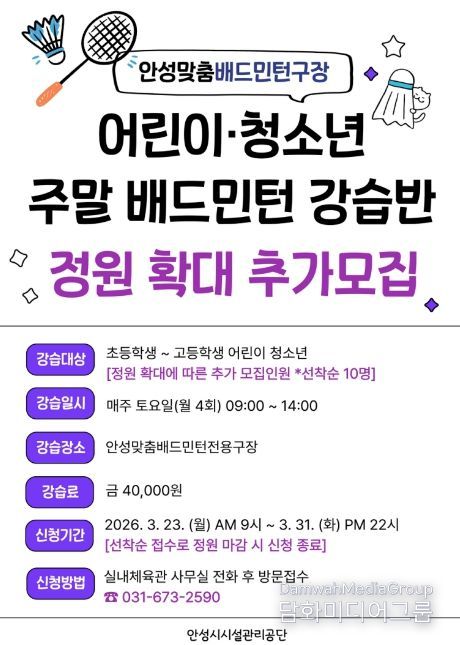 시민행정신문 강갑수 기자 | 안성시시설관리공단은 안성 시민 생활체육 활성화를 위해 현재 운영 중인 주말 어린이・청소년 배드민턴 강습반 정원을 확대하고 추가 수강생을 모집한다고 밝혔다.