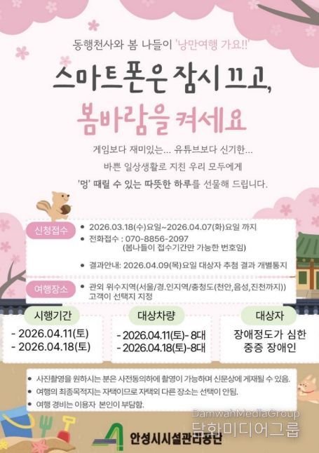 신청기간은 3월 18일부터 4월 7일까지이며, 운영일자는 4월 11일과 4월 18일이다. 지원규모는 회차별 8대 차량으로 총 16대이며, 신청방법은 전화 접수로 선착순 마감된다. 여행 목적지는 신청자가 희망하는 지역으로 서울·경기·인천·충청권 등에서 자율적으로 선택할 수 있다.