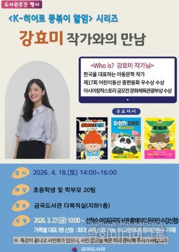 시민행정신문 강갑수 기자 | 부산 북구는 제62회 도서관주간을 맞아 4월 18일 오후 2시, 금곡도서관에서 인기 동화 'K-히어로 똥볶이 할멈'의 저자 강효미 작가를 초청해 ‘작가와의 만남’을 개최한다고 밝혔다.