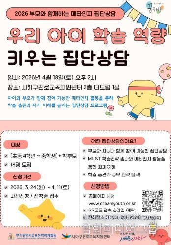 시민행정신문 강갑수 기자 | 사하구진로교육지원센터는 오는 4월 18일 토요일 오후 2시, MLST 학습전략 검사와 부모·자녀 간 학습 역지사지 역할극 활동을 통해 타인과 자기 이해에 도움을 주는 '메타인지 집단상담' 프로그램을 운영한다.