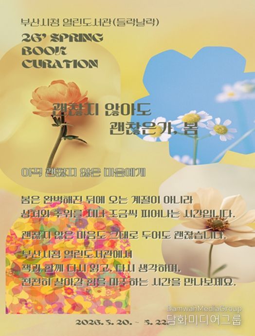 시민행정신문 강갑수 기자 | 부산시청 열린도서관이 오늘(20일)부터 5월 22일까지 봄 도서 큐레이션 '괜찮아지지 않아도 괜찮은가, 봄' 전시와 체험프로그램을 운영한다.