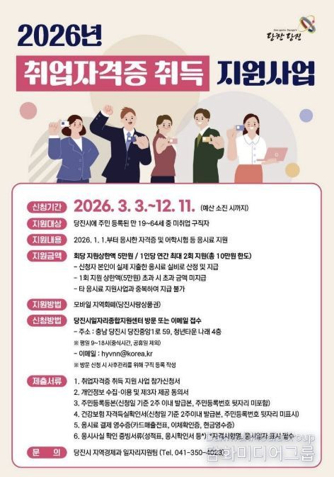 시민행정신문 강갑수 기자 | 당진시는 시민들의 취업 역량 강화를 위해 ‘2026년 취업 자격증 취득 지원사업’을 추진하고 지원 대상자를 모집한다고 20일 밝혔다.