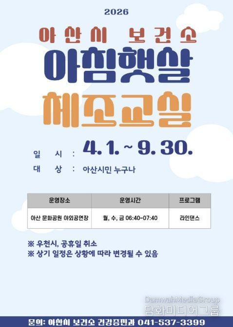시민행정신문 기자 | 아산시보건소는 오는 4월 1일부터 9월 30일까지 시민들의 건강한 일상 실천을 돕기 위해 아침과 저녁 시간대에 ‘2026년 건강체조교실’을 운영한다.