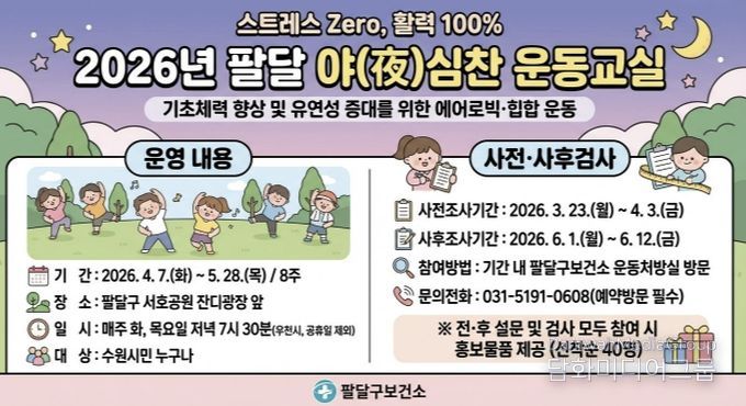 시민행정신문 기자 | 수원시 팔달구보건소가 시민들의 건강 생활 실천을 돕고 비만율을 낮추는 프로그램 ‘2026년 팔달 야(夜)심찬 운동교실’을 운영한다.