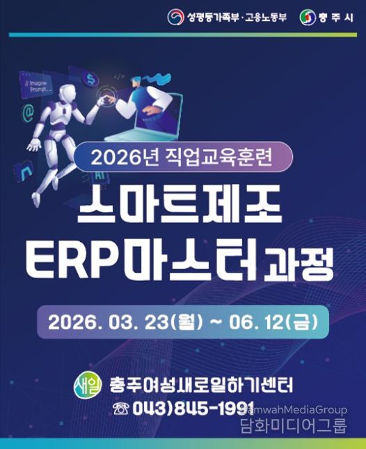 한편, 충주여성새로일하기센터는 2026년 ▲스마트제조 ERP마스터 과정을 포함해 ▲끝장실전사회복지행정실무 과정 ▲시니어맞춤돌봄스킬업 과정 등 총 3개의 직업교육훈련 과정을 운영할 계획이다.