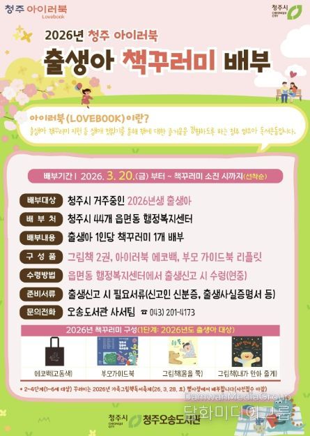 시민행정신문 강갑수 기자 | 청주오송도서관은 영유아 독서운동 ‘청주 아이러북(LoveBook)’의 일환으로 2026년 출생아를 위한 생애 첫 책꾸러미를 배부한다고 23일 밝혔다.