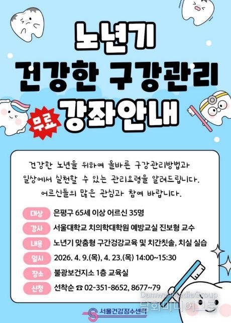 강연은 다음 달 9일과 23일 오후 2시, 불광보건지소 1층 교육실에서 진행된다. 진보형 서울대학교 치의학대학원 교수가 노년기 구강 관리의 중요성과 실생활에서 실천할 수 있는 관리 방법을 강의하며, 치간칫솔과 치실 사용법 체험 교육도 함께 진행된다.