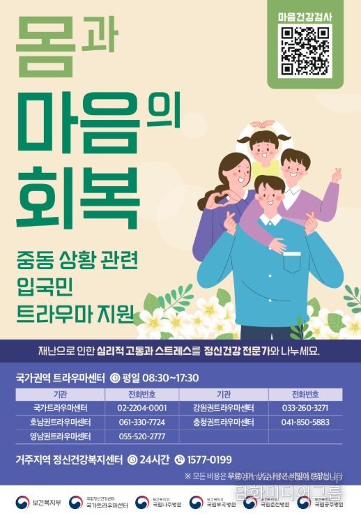 지원 대상은 중동지역 상황으로 정신적 피해를 입은 입국민과 재외동포, 전쟁 관련 소식 등으로 심리적 어려움을 겪고 있는 지역 주민이다.