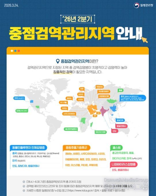 임승관 질병관리청장은 “해외 감염병 발생현황을 면밀히 모니터링하여 분기마다 중점검역관리지역을 지정·해제하고 있다”며 “해당 지역을 방문하는 경우 출국 전 감염병 정보를 사전에 확인하고 입국 시에는 Q-CODE 등을 통해 건강 상태를 성실히 신고해 줄 것을 당부드린다”고 밝혔다.