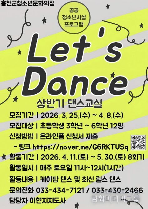 시민행정신문 강갑수 기자 | 홍천군청소년문화의집은 지역 내 초등학생 3학년부터 6학년까지의 청소년을 대상으로 공공 청소년시설 프로그램 “댄스 교실 Let’s Dance” 상반기 참가자를 모집한다.