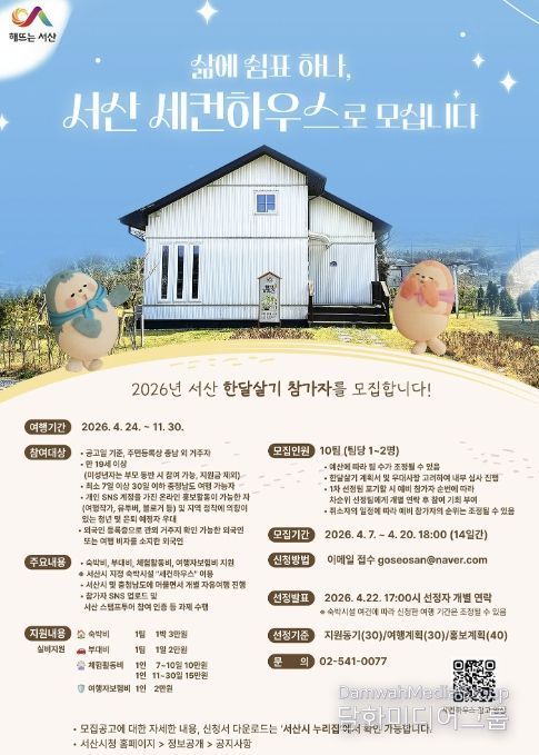 오은정 서산시 관광과장은 “서산 한 달 살기는 단순한 여행을 넘어 서산의 일상을 직접 경험할 특별한 기회”라며 “앞으로도 다양한 체류형 관광 시책을 발굴해 서산을 찾는 방문객들에게 더욱 풍성한 경험을 제공할 수 있도록 노력하겠다”라고 말했다.