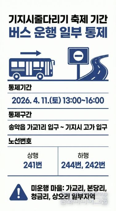 이번 통제는 4월 11일 오후 1시부터 4시까지 3시간 동안 송악읍 가교1리 입구~기지시 고가 입구 구간에서 실시한다. 해당 시간 동안 시내버스 상행 241번, 하행 244번, 242번 노선은 해당 구간을 우회 운행한다.