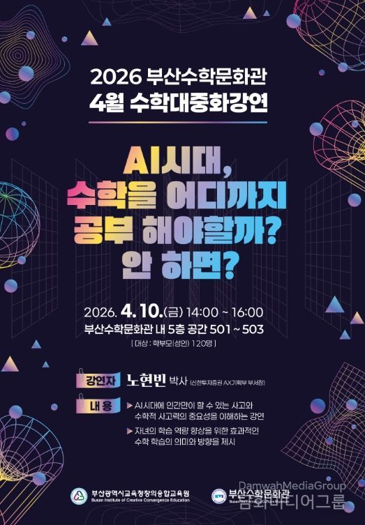 시민행정신문 기자 | 부산광역시교육청창의융합교육원 분원 부산수학문화관은 오는 10일 오후 2시 부산수학문화관에서 학부모 및 시민 120여 명을 대상으로 ‘4월 수학대중화 강연’을 개최한다.