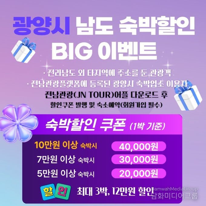 이벤트 참여를 희망하는 관광객은 전남관광플랫폼(JN TOUR)에 회원가입한 뒤 ‘남도 숙박할인 BIG 이벤트’에서 ‘광양시’를 선택해 쿠폰을 발급받으면 된다.