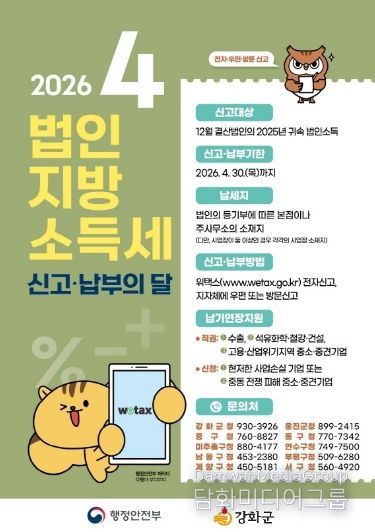 시민행정신문 강갑수 기자 | 강화군은 관내 법인 사업장을 대상으로 4월 법인지방소득세 신고·납부 기간이 도래함에 따라 기한 내 신고·납부를 당부했다.