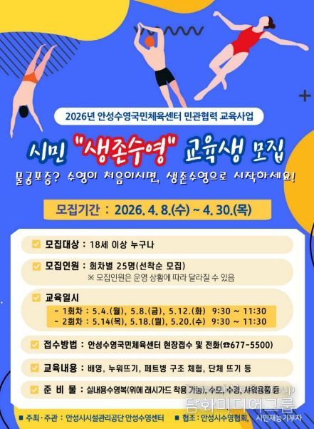 시민행정신문 강갑수 기자 | 안성시의 수상 안전망이 전 세대로 확대된다. 안성시시설관리공단이 운영하는 안성수영국민체육센터는 최근 증가하는 수상 사고에 대비해, 초등학생 중심이었던 생존수영 교육을 전 시민 대상으로 확대하는 ‘시민 생존수영교육 혁신사업’을 추진한다. 이번 사업은 공공 체육시설의 유휴 자원을 효율적으로 재배치해 시민들의 실전 생존기술 습득을 돕기 위해 마련됐다.