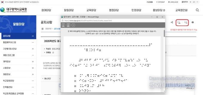 해당 서비스는 각종 공지사항과 대구교육 관련 소식 등 누리집 내 게시글을 ‘전자 점자’로 변환해 열람하거나 내려받을 수 있는 기능이다.