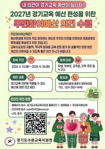 시민행정신문 기자 | 경기도수원교육지원청은 4월 13일부터 5월 26일까지 2027년도 경기교육 예산 편성을 위한 주민참여예산 의견수렴을 실시한다.