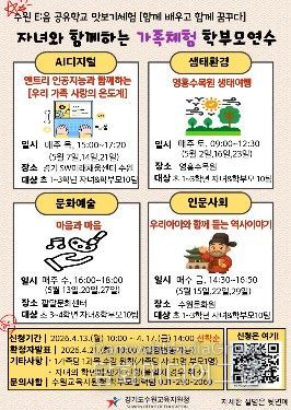 수원교육지원청은 오는 5월 한 달간 관내 초등학생 자녀와 학부모를 대상으로 지역 인프라를 적극 활용한‘2026년 가족체험 학부모연수’인 '공유학교 맛보기 체험:함께 배우고 함께 꿈꾸다'를 운영한다고 밝혔다.