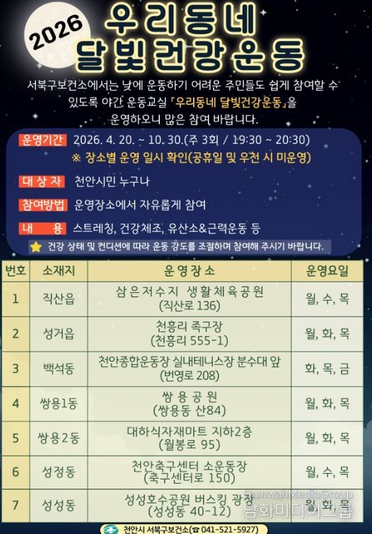 시민행정신문 기자 | 천안시는 오는 20일부터 10월 30일까지 ‘우리동네 달빛건강운동’을 운영한다고 10일 밝혔다.