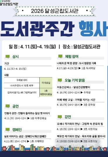 시민행정신문 기자 | 대구 달성군립도서관이 ‘2026년 도서관 주간’을 맞아 오는 11일부터 19일까지 주민들을 위한 다채로운 독서 문화 행사를 개최한다.
