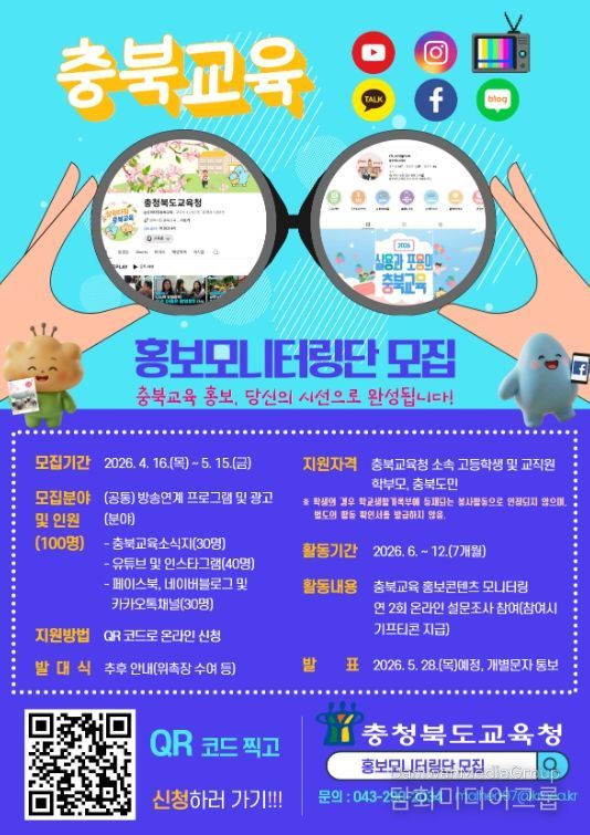 시민행정신문 기자 | 충청북도교육청은 16일부터 5월 15일까지 교육가족과 도민의 다양한 의견을 반영한 홍보를 강화하기 위해 '2026. 충북교육 홍보 모니터링단'을 모집한다.