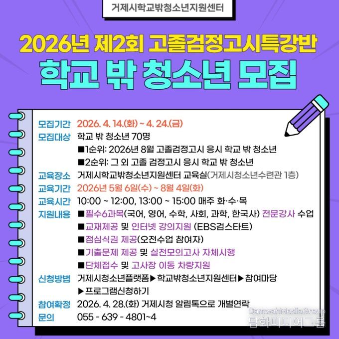 시민행정신문 기자 | 거제시학교밖청소년지원센터에서는 2026년도 제2회 고등학교 졸업학력 검정고시 대비 검정고시특강반에 참석할 학교 밖 청소년을 모집한다.
