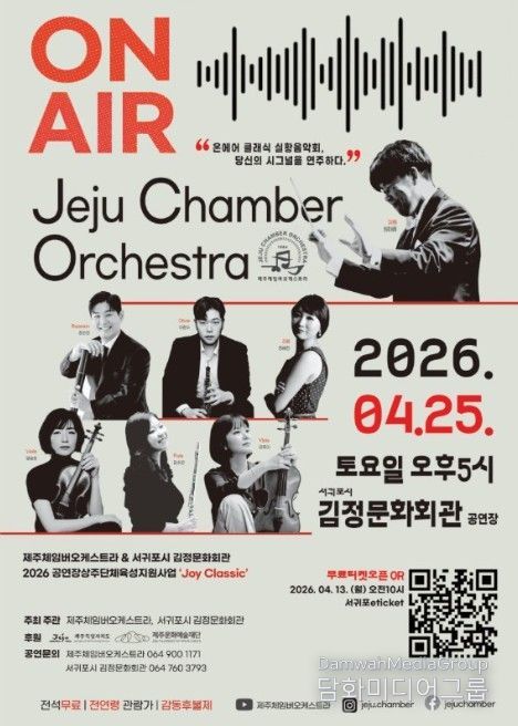 시민행정신문 기자 | 서귀포시는 2026년 공연장 상주단체 육성지원 사업의 일환으로 제주체임버오케스트라의 공연 '온 에어'를 4월 25일 오후 5시에 김정문화회관에서 개최한다고 밝혔다.