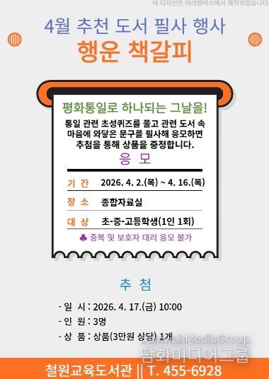 시민행정신문 기자 | 철원교육도서관(관장 김민서)은 4월부터 11월까지 종합자료실에서 지역 초·중·고 학생을 대상으로 추천 도서 필사 행사 ‘행운 책갈피’를 8회 운영한다.