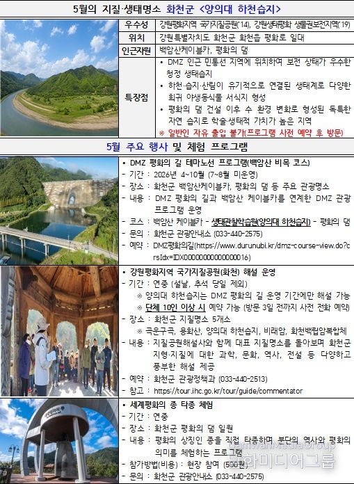 강원특별자치도 관계자는 “화천 양의대 하천습지는 디엠지(DMZ) 인근의 청정 자연환경과 생태적 가치를 동시에 갖춘 소중한 자원”이라며, “5월의 싱그러운 자연 속에서 생태와 평화가 어우러진 특별한 여행을 경험하시길 바란다”고 말했다.