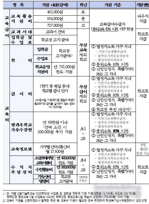 교육급여 대상자는 초‧중‧고 교육활동지원비, 고교 입학금 및 수업료, 고교 교과서대를 지원받을 수 있으며, 교육비 대상자는 고교 학비, 고교 급식비, 방과후학교자유수강권, 인터넷통신비, 수익자부담경비를 지원받을 수 있다. 다만 무상교육 및 무상급식 지원 대상 학생은 고교 학비와 급식비 지원에서 제외된다.