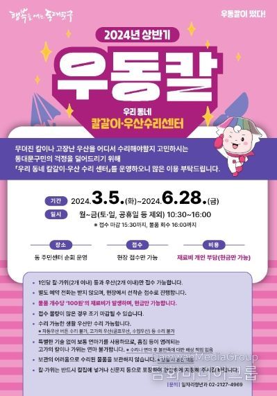 시민행정신문 강갑수 기자 | 서울 동대문구가 14개 동주민센터를 순회하며 무뎌진 칼과 가위, 고장난 우산을 수리 해주는 ‘우리 동네 칼갈이 ‧ 우산수리 센터’의 2024년 상반기 일정을 3. 5.(화) 청량리동에서 시작했다.