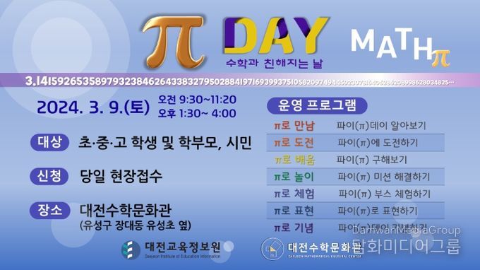 시민행정신문 김지은 기자 | 대전교육정보원(원장 박현덕) 부설 대전수학문화관은 3월 9일, ‘수학과 친해지는 날’파이(π)데이 행사를 개최한다고 밝혔다.