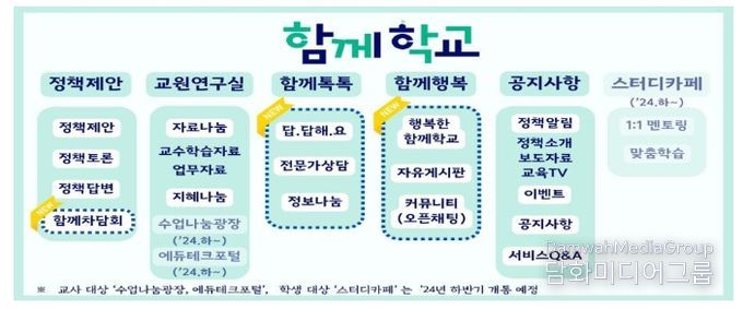 「함께학교'는 이번에 교원뿐만 아니라 학부모, 학생에게 도움이 되는 상담, 소통(커뮤니티 등) 기능을 신설하고, 접근 편의성을 개선하여 학생-교원-학부모의 소통을 더욱 활성화하는 데 초점을 두었다.
