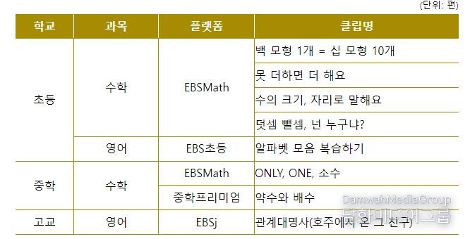 교육부는 한국교육방송(EBS)과 협력하여 한국교육방송공사(EBS)가 보유한 개념 이해 동영상 1,300여 편과 평가문항 97,000개(수학 73,000개, 영어 24,000개) 등을 개발사에 제공한다. 또한, 앞으로 한국과학창의재단의 알지오매스(디지털 수학용 공학도구) 연계 등을 통해 교육콘텐츠 지원을 강화할 계획이다. 이를 통해 인공지능(AI) 디지털교과서로 학생은 학습 수준‧속도에 맞는 콘텐츠로 배우게 되어 학습에 자신감을 가지고, 교사는 학생 맞춤교육을 실현할 수 있을 것으로 기대된다.