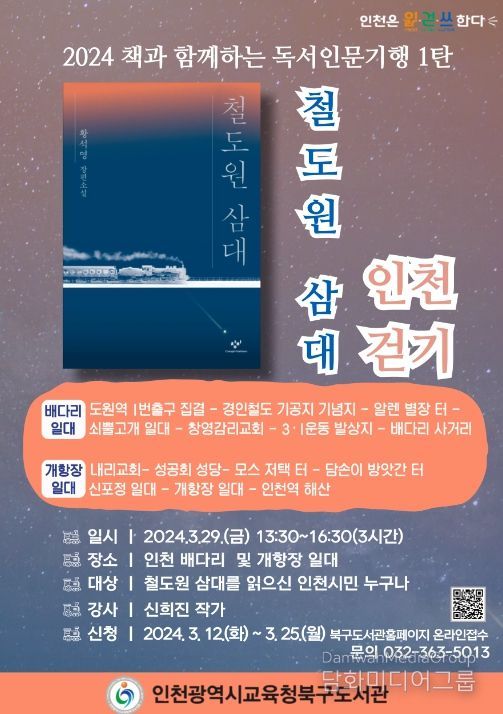 시민행정신문 김지은 기자 | 인천광역시교육청북구도서관은 읽걷쓰 사업의 일환으로 2024년 '책과 함께하는 독서인문기행' 1탄 ‘철도원 삼대’ 인천 걷기 탐방 참여자를 25일까지 모집한다.